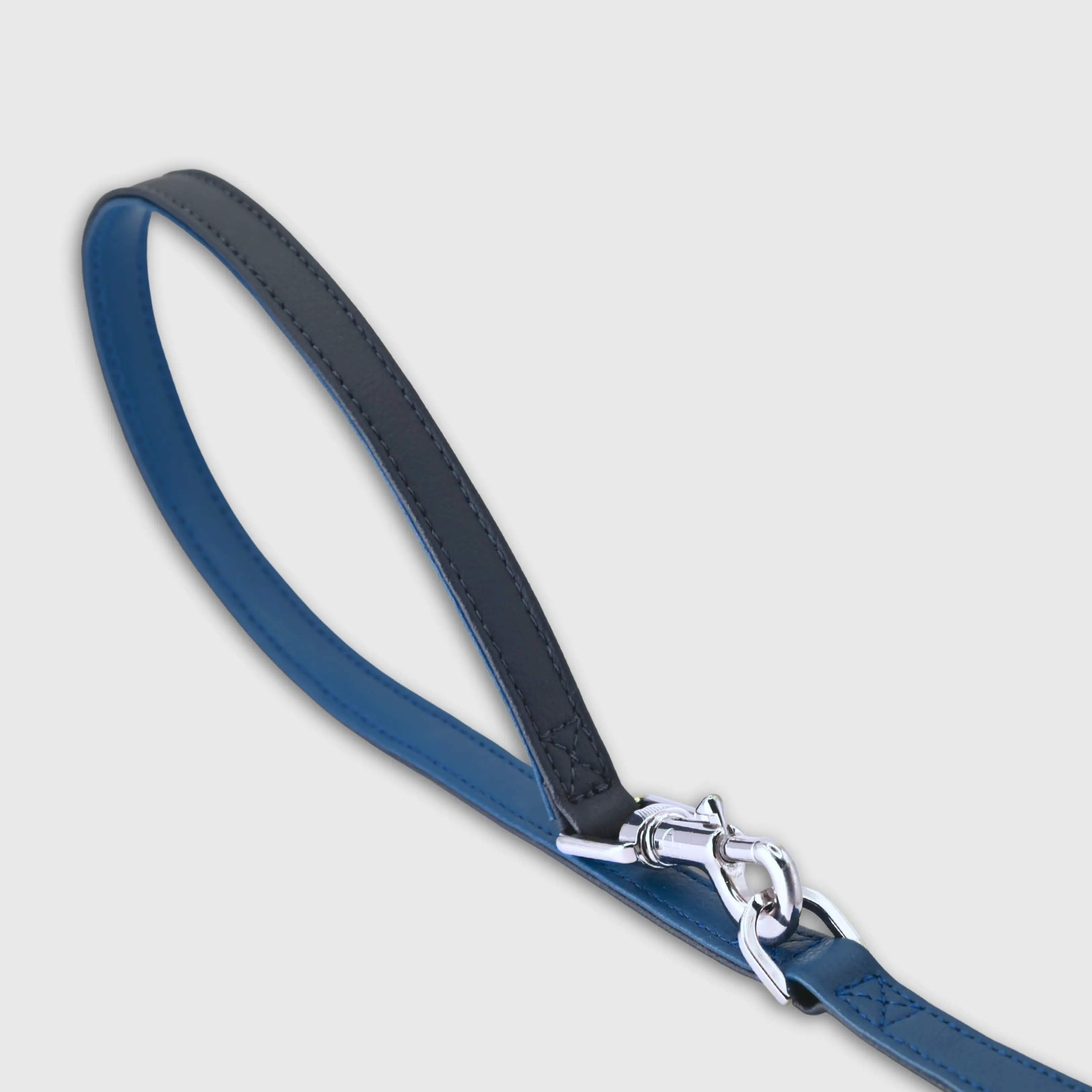 Hand-stitched from grained, cactus vegan leather in an artisan workshop in the EU. Characterized by Pattmond’s signature shape, distinguished by subtle shifts in width and refined ornamental details. Navy cactus-based leather with matching navy stitching. Solid brass hardware in silver (signature snap hook and logo studs), nickel-free and protected with a durable, polished finish. Adjustable length of 230 cm, 150 cm, and 115 cm. With a width of 2.2 cm, it is proportioned for larger dogs.